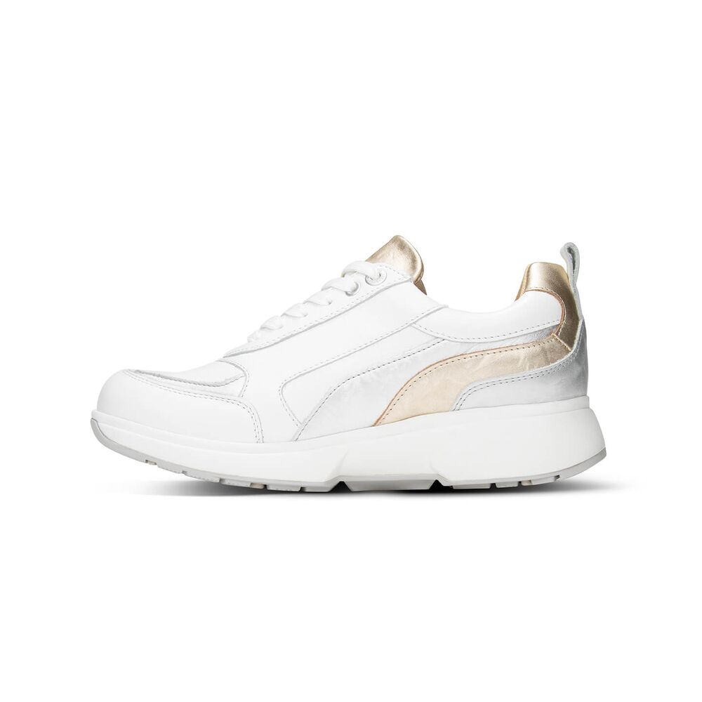 De Xsensible Stretchwalker Sneaker Valletta 30222.3.109 HX White Combi is een zeer comfortabele sneaker met een uitstekende pasvorm. Het buitenwerk is gemaakt van wit gladleer met gouden en zilveren details. Verder is de binnenkant leer gevoerd. De sneaker heeft een zeer goed en comfortabel voetbed dat ook uitneembaar is, zodat er eventueel eigen steunzolen in kunnen worden gedragen. De schoen heeft een breedte maat H, voor de iets bredere voet. De zool is zeer stabiel en slijtvast en draagt bij aan een geweldig loopcomfort. Loopcomfort gegarandeerd! Hieronder nog wat extra informatie over Xsensible.